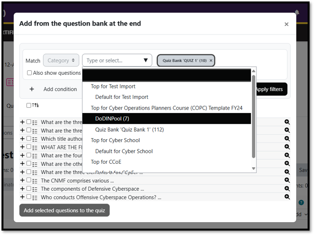 7. On the Type or Select box, hit the drop down arrow and select the name of the Pool or Test that you imported (it should show the number of questions that the package contained). Once selected, choose the questions to add to the new quiz or if you are imported a pool select the number of questions to import and click Add selected to save your work.