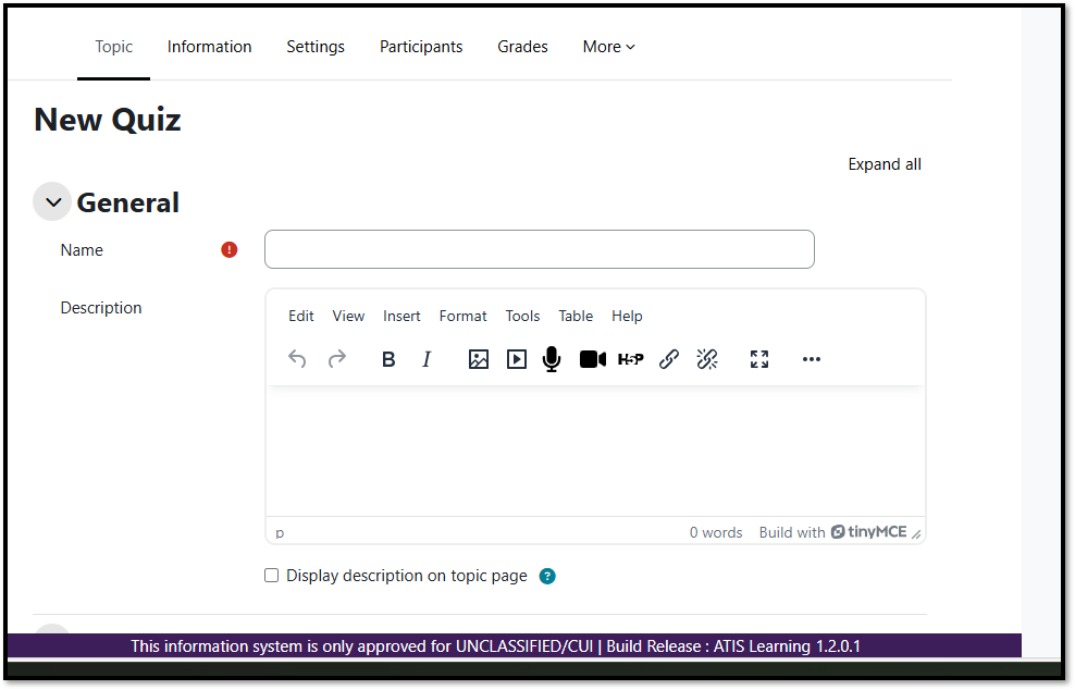 1. This guide assumes that you are currently logged into the ATIS-CTE environment and in the Topic/Course you wish in import the question banks into. Click the + Add an activity or Resource button, and choose to the Quiz.